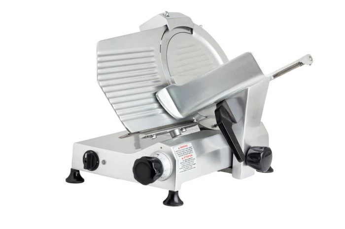 Thanks to its adjustable thickness knob, it allows staff to easily adjust slices from 0 to 5/32″thick. For convenient sharpening, this meat slicer features a built-in sharpener. Exceptionally durable, this manual gravity feed meat slicer is made from anodized aluminum while its easy-to-clean one piece base with no crevices prevents bacteria build-up.